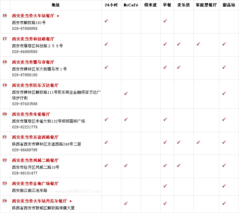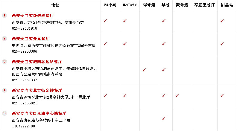 西安麥當勞網上訂餐,宅急送,外賣,麥樂送網上訂餐為顧客提供訂餐送餐服務,西安麥當勞訂餐電話4008517517,這里你可以查找西安市麥當勞餐廳地址和分店電話號碼。以及麥當勞24小時營業餐廳,麥咖啡McCafe,得來速,早餐,麥樂送,家庭型餐廳,甜品站分布情況。