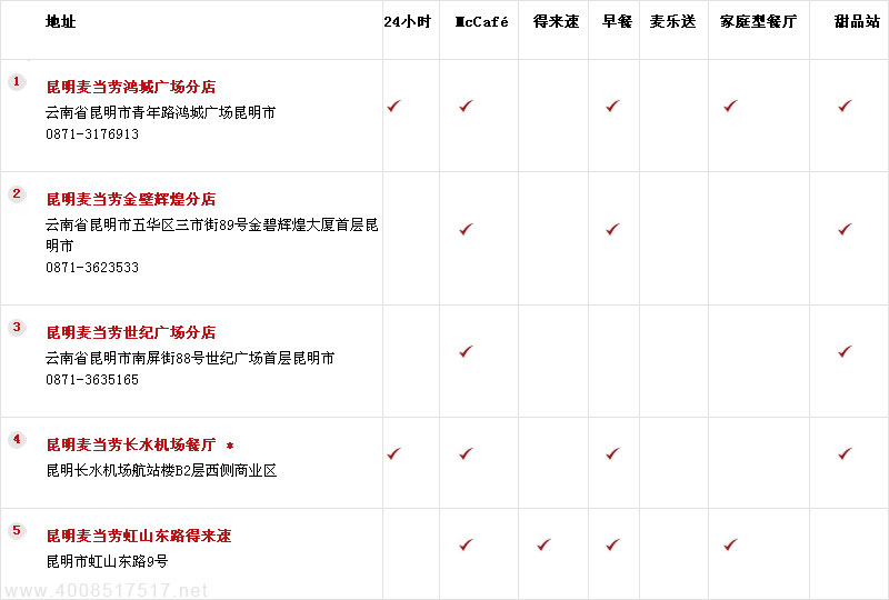 地址:云南省昆明市南屏街88號世紀廣場首層,電話:0871-3635165,提供麥咖啡McCafe、有甜品站。