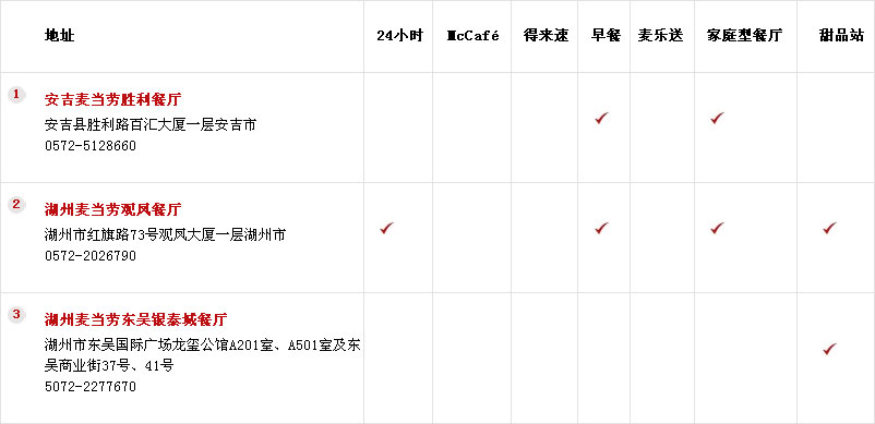 湖州麥當勞網上訂餐,宅急送,外賣,麥樂送網上訂餐為顧客提供訂餐送餐服務,湖州麥當勞訂餐電話4008517517,這里你可以查找湖州市麥當勞餐廳地址和分店電話號碼。以及麥當勞24小時營業餐廳,麥咖啡McCafe,得來速,早餐,麥樂送,家庭型餐廳,甜品站分布情況。